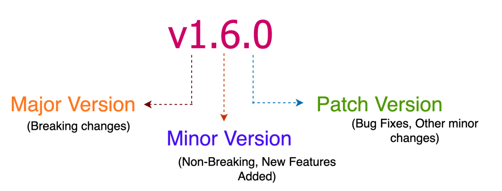As indicated in the image, major version is incremented when there is any breaking change. E.g., in cases where the interfaces are changed, then the consumers of the service should update their dependency version to receive the latest changes. Minor version is incremented when there is any new feature or features added and is generally non-breaking in nature which means its backward compatible. Patch version is again non-breaking in nature and is incremented when we fix smaller bugs, or make any minor improvements in the code, that does not affect its previously agreed functionality.